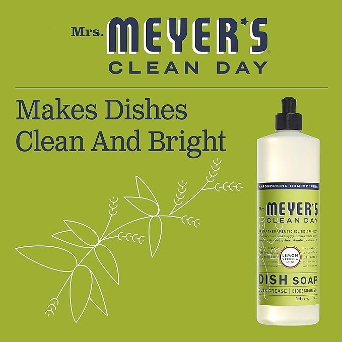 MRS. MEYER'S CLEAN DAY Liquid Dish Soap, Cruelty Free and Non-Toxic, Lemon Verbena Scent, 16 oz- Pack of 6