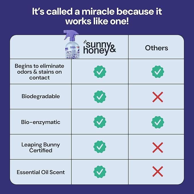 - Pet Stain Power: Sunny & Honey Pet Stain Miracle wipes out pesky pet messes fast, handling everything from doggie accidents to kitty spills. This stain remover spray is perfect for busy households with carpets, couches, and mattresses