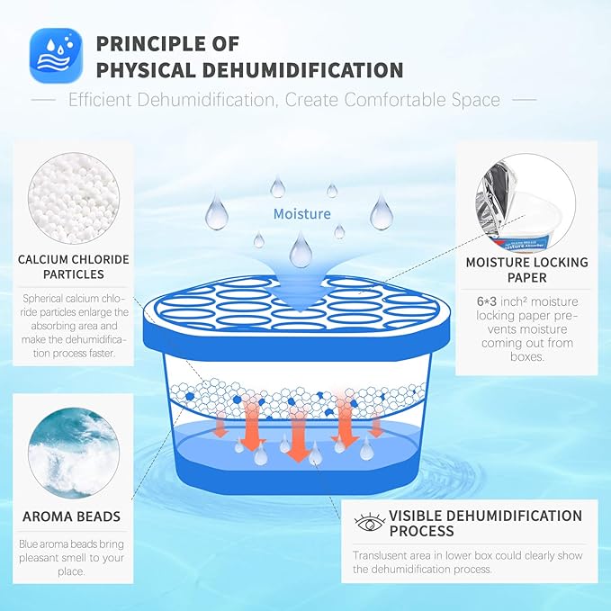 - Efficient Dehumidification: Traps excess moisture quickly. Vacplus moisture absorbers use spherical calcium chloride to enlarge the absorbing area. The large collecting capacity of this moisture remover keeps a long time dry.