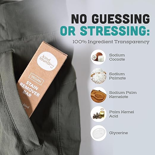- Tackle Tough Stains - Wash away food, make-up, period stains and more with our vegan stain remover bar. Made with powerful natural surfactants, our stain remover soap bar removes unwanted marks on your clothes in no time!