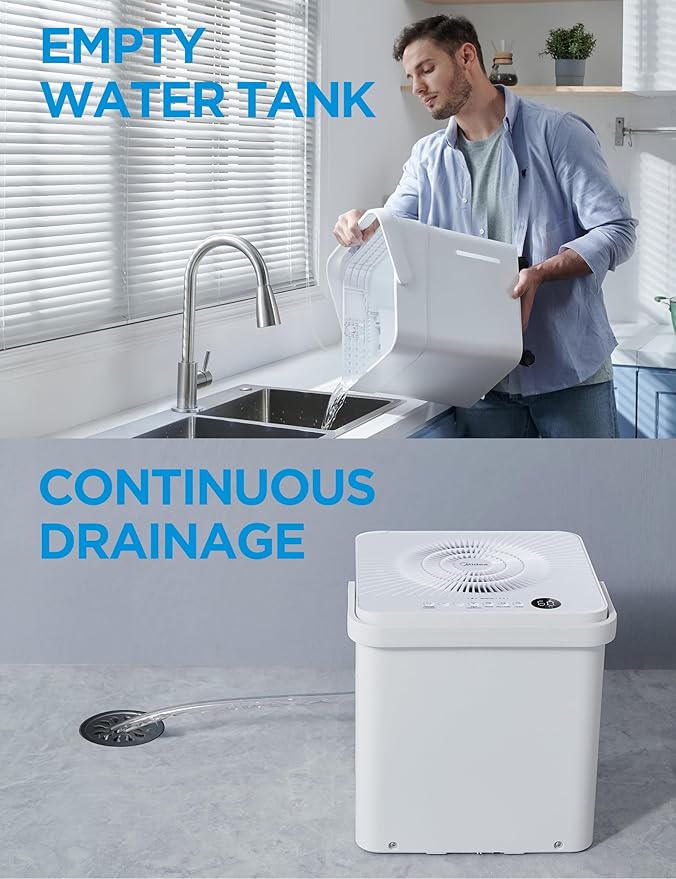 - DEHUMIDIFIER WITH DRAIN HOSE allows CONTINUOUS DRAIN OPTION - Versatile, no-bucket option provides more flexibility to remove moisture. You can remove the water tank and place the unit above the sink using the included drain hose, or position it over a floor drain, near a window or door.