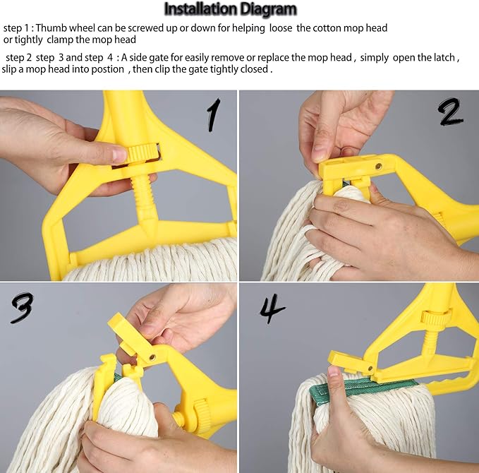 - >> Installation : Thumb wheel can be screwed up or down for helping release the mop head or tightly clamp the mop head down into the position . A side gate for easily remove and replace mop head, Simply open the latch, slip the mop head into the position ,then clip the gate tightly