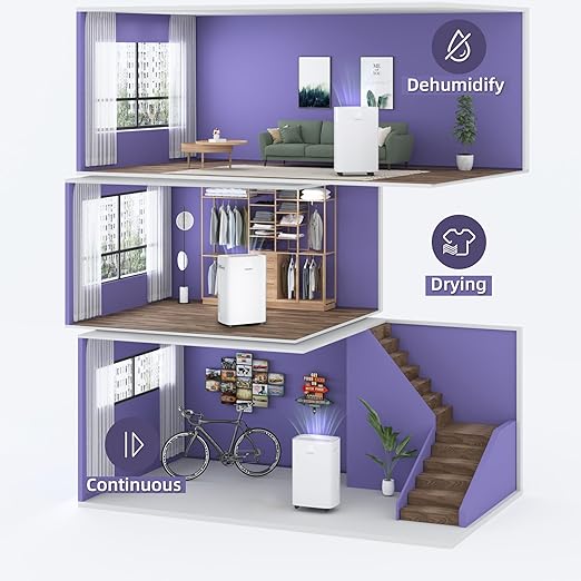 - 4500 Sq.Ft DEHUMIDIFIER: This dehumidifier effectively removes up to 50 pints (under 95°F, 90%RH condition) of moisture per day (Please note: The max dehumidification capacity is up to 50 pints under 95°F, 90%RH working condition) in areas up to 3,500 Sq. Ft. With the adjustable humidity from 30%RH to 80%RH, it is an ideal dehumidifier for any damp basement, office, home, bathroom, bedroom, kitchen, stockroom, living room, laundry room, cellar, crawlspace, large space/room, and more.