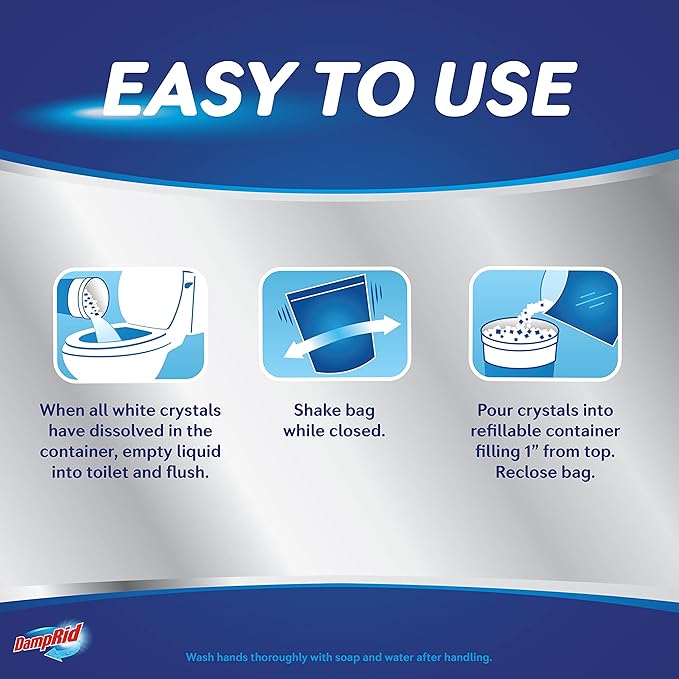 - EASY TO USE: When the DampRid container is full of water, just pour the liquid out and refill with more calcium chloride crystals. Not for use in moving vehicles. Keep out of reach of children.