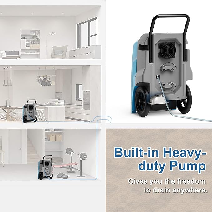 - Memory Starting, Optional Drainage: Featuring an internal heavy-duty condensate pump of 14.7 ft drain height connecting with a 19.6 ft long drain hose (included), which make it easy to drain the condensation automatically anywhere. this commercial dehumidifier features with automatic restart after power outages, auto defrost, continuous drainage (built-in pump) for effortless humidity control.