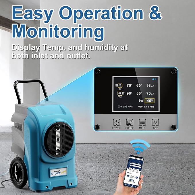 - ✔【App Control & Dry anywhere】 MONITOR THE RESTORATION PROCESS ON THE GO! Our free AlorAir DryEasy mobile APP is included with the Commercial Dehumidifier upon purchase. Simply adjust to your ideal moisture setting, it will smartly sense room humidity and control dehumidification to maintain pre-set humidity levels.Automatic Shut Off/On: Shuts off automatically when the room humidity reaches the setting humidity and restart to working again when the humidity is above.