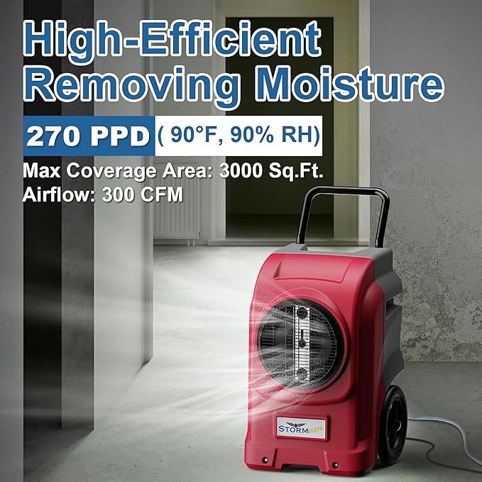 - ✔【270 PINT DEHUMIDIFIER】Capacity industrial dehumidifiers are ideal for water damage restoration projects, its high efficiency rotary compressor ensures the maximum moisture extraction.Our commercial dehumidifier remove up to 270 pints (under 95°F,90%RH condition) of moisture per day ,coverage up to 3000 sq. ft.It is a dehumidifier perfect for many sites with high moisture such as scientific researching, commodity storage, underground engineering.