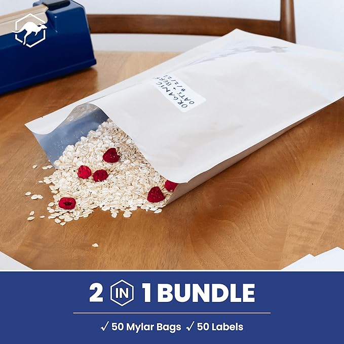 - 2 in 1 BUNDLE - Includes 30 5 Mil thick, heat-sealable, 2.5 gallon Mylar bags and 30 sticker labels. Perfect for pantry items like flour, sugar, rice, freeze dried or dehydrated foods. Oxygen absorbers sold separately, 1000cc recommended.
