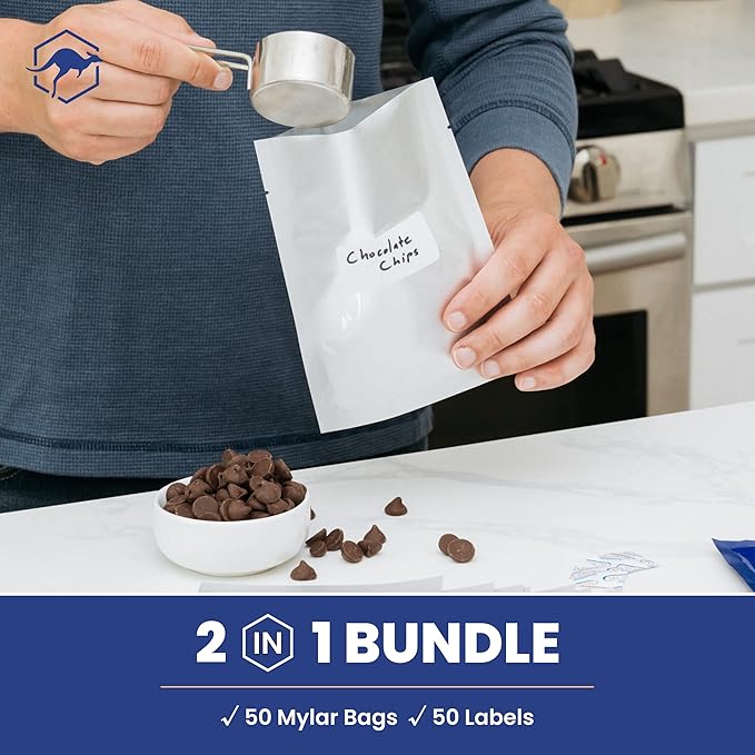 - 2 in 1 BUNDLE - Includes 50 5 Mil thick, heat-sealable, 1 cup Mylar bags and 50 sticker labels. Perfect for pantry items like flour, sugar, rice, freeze dried or dehydrated foods. Oxygen absorbers sold separately, 200-300cc recommended.