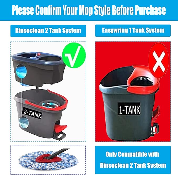 - Only Fit for RinseClean 2-Tank Bucket System: Our spin mop head replacement package includes 10 pcs; each mop head is individually packaged for easy storage and space-saving; The spin mop replacement head fit not only for the triangular base but also for the bucket, but only compatible with RinseClean 2-tank system bucket mop, and NOT fit for 1-Tank Spin Mop System.