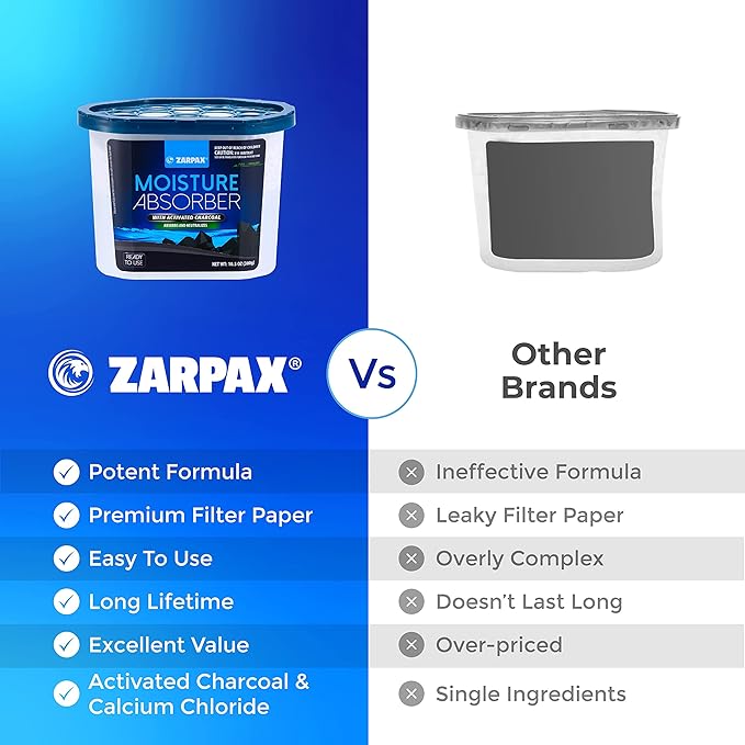 - REFRESH YOUR ENVIRONMENT: Our moisture absorbers are composed of calcium chloride which proficiently absorbs and traps excess moisture rapidly, and activated charcoal helps eliminate and prevent bad odors. ZARPAX's humidity absorber features premium moisture-locking filter paper to ensure no water leakage, only a dry and fresh environment.