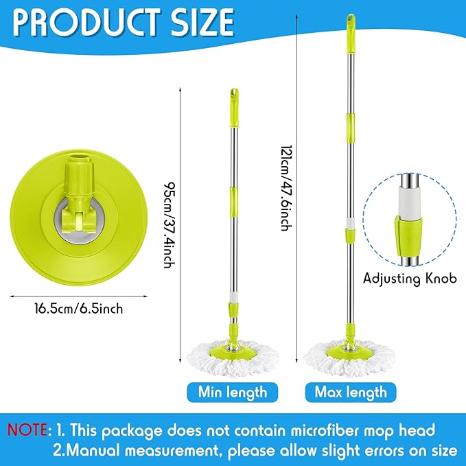 - Suitable Sizes: the outer diameter of head of spin mop handle is about 6.5 inches/ 16.5 cm, while inner diameter is about 6.3 inches/ 16 cm (Suitable for mop heads with a diameter of 16 cm); Stick length (fully extended): 47.24 inches/ 120 cm, stick length (not fully extended): 35.43 inches/ 90 cm; The full extension can reach 47.6 inches in length. Please confirm the diameter of your mop head and the size of the mop bucket before purchasing