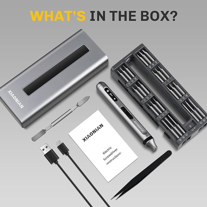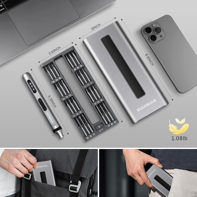 - Ergonomic Design & Transparent Case: Xiaonian electric screwdriver cordless features a pen-like, non-slip grip design with aluminium alloy construction. The transparent case allows for convenient charging without removing the screwdriver.