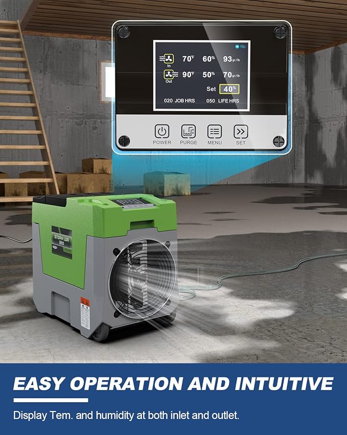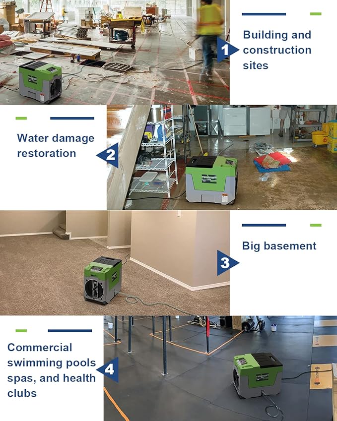 - COMMERCIAL, INDUSTRIAL, And BASEMENT USE: With the new design and layout of the machine, the volume of the whole machine is 40% smaller than others on the market, ideal for flood restoration, carpet cleaning, basements/cellars, laundries, de-flooding, or anywhere you need to extract moisture at a professional level. The built-in pump lets drying work hard overnight or continuously for days at a time without you worrying about it.