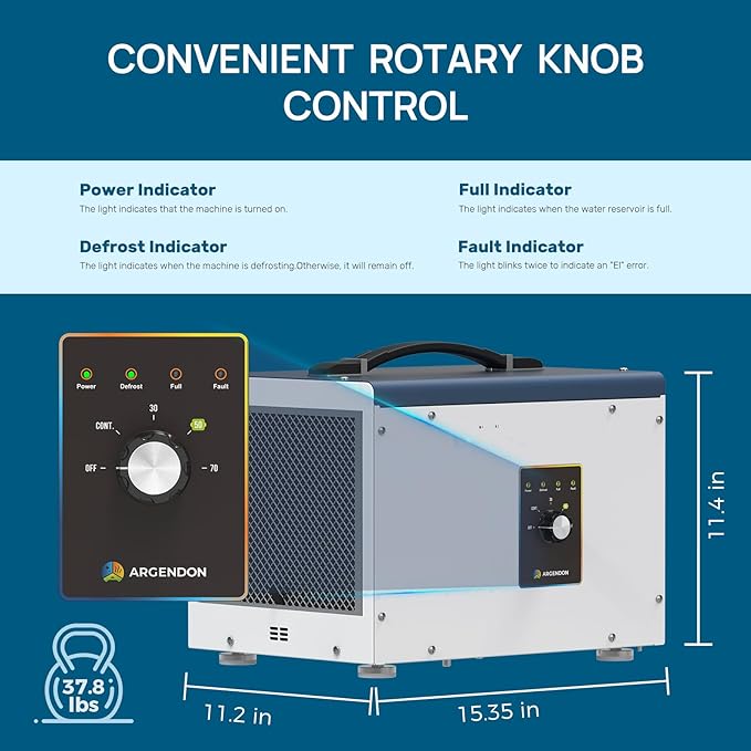 ARGENDON Dehumidifier for Crawlspace Basement, Commercial Dehumidifier with Drain Hose 70 PPD, Compact, Ideal for Water Damage Storage Up to 1000 Sq Ft, 5-Year Limited Warranty