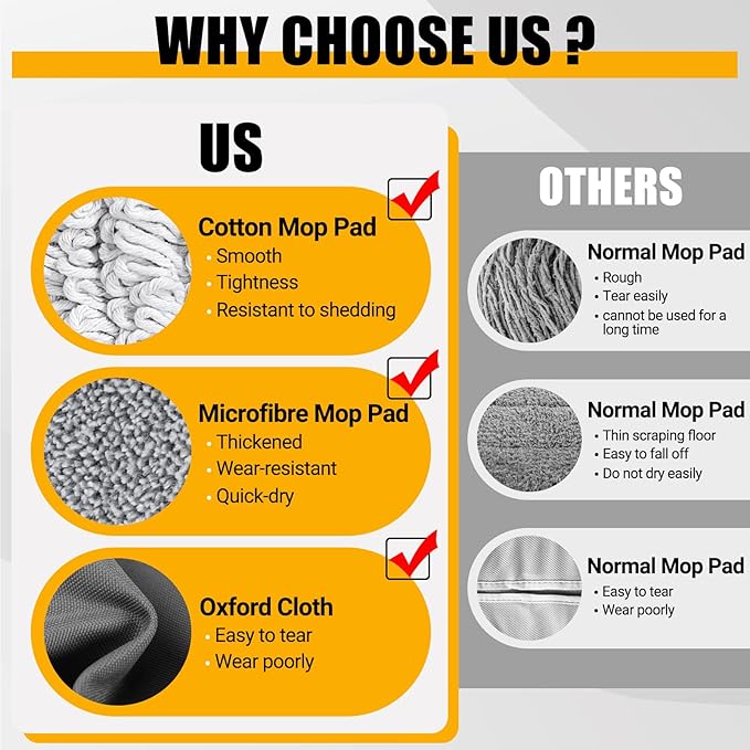 - Wet & Dry Cleaning Industrial Mop: The Microfiber Industrial Flat Mop is equipped with a premium quality 1 cotton and 2 microfiber mop pads, which easily absorb dirt and quickly absorb water stains, perfect for wet mop and dry cleaning. You can hand wash the mop pad with warm water or put the mop pad in the washing machine to wash it.