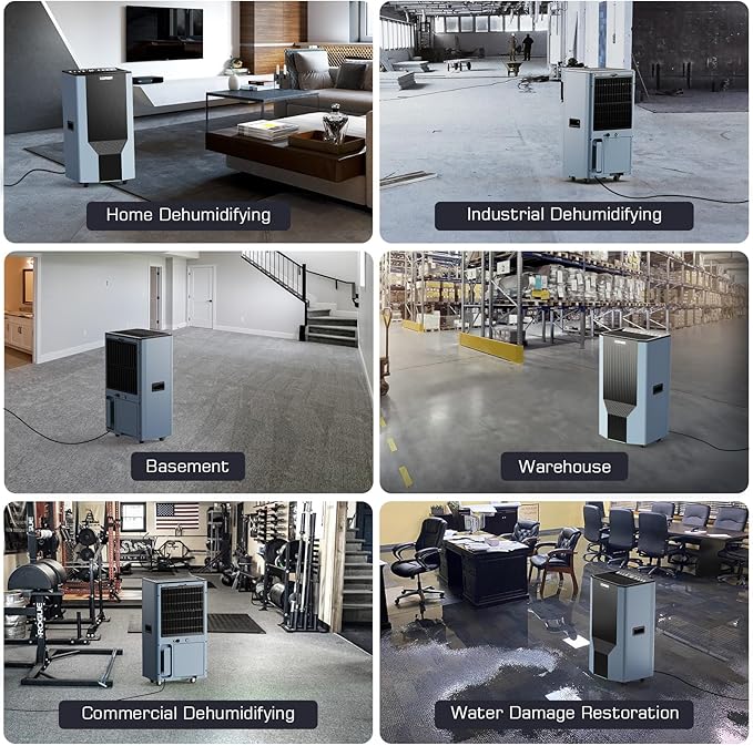 - 【Three Drainage Options for Any Setting】This commercial dehumidifier offers a built-in pump (lifts water up to 19.6 feet), a 120 OZ (0.95 gallon) tank, and gravity drainage. Ideal for bedrooms, laundry rooms, basements, or offices. Smart sensor auto-pauses operation and flashes LED alerts at 95% capacity, eliminating overflow risks during overnight/remote operations