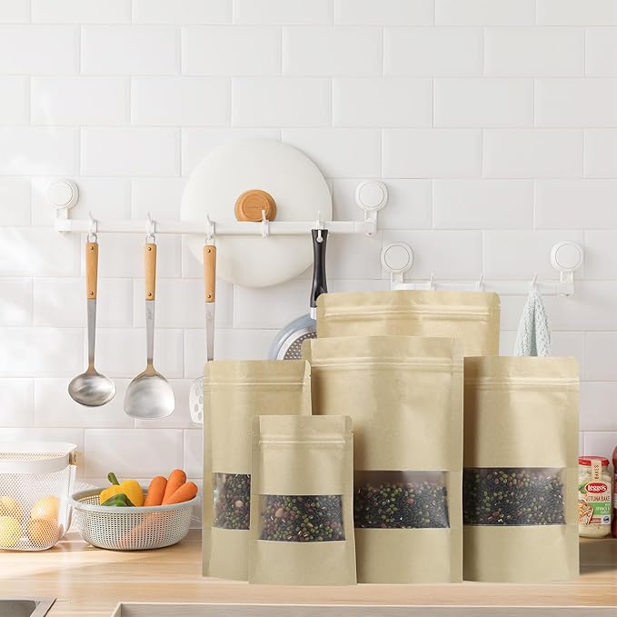 100 Pack Bags, Resealable Bags with Clear Window, Stand-up Bags for Sealing Storage, Scratch Resistant Hand Storage Bags. (Kraft Paper, 4.7×7.9 Inch)
