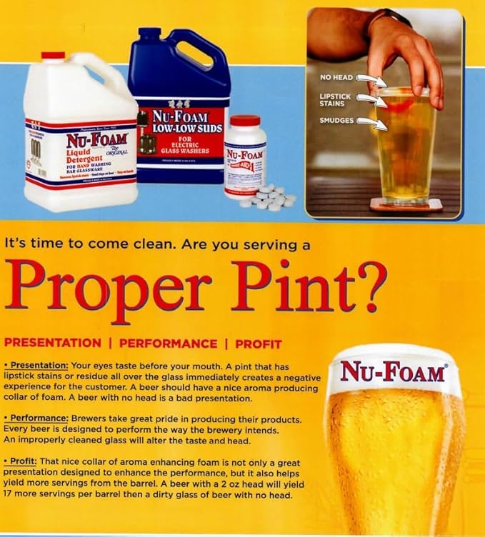 - Effective & Efficient: Designed for taverns, pubs, and restaurants, Nu-Foam goes beyond basic cleaning. With a highly concentrated formula, 1 oz per 3 gallons, it removes fats, grease, and oil from glassware, ensuring beer retains its head for a flawless pour. The result? More servings per keg and increased advantages for your establishment.