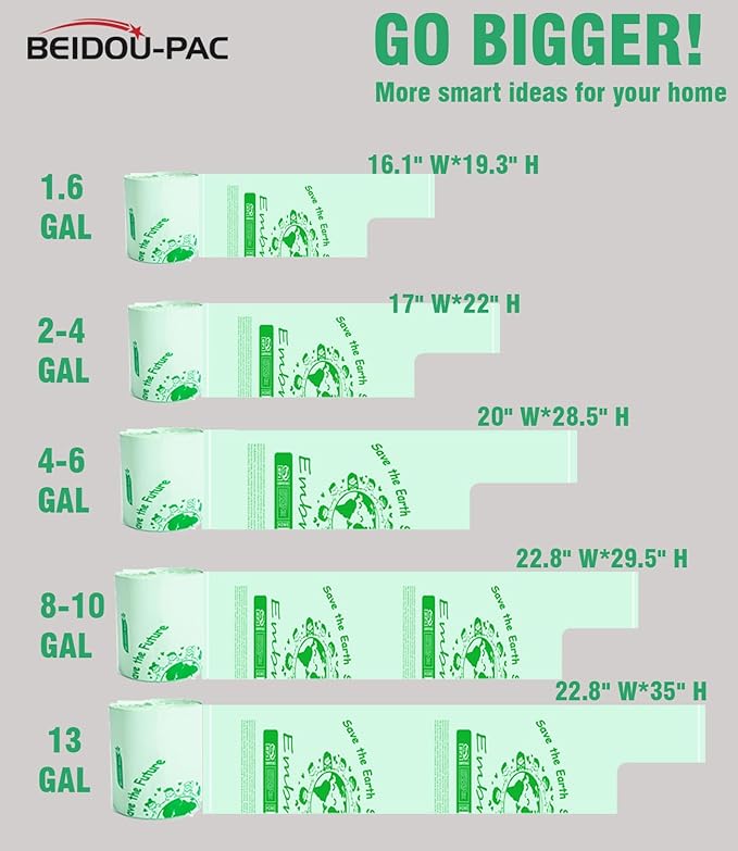 - [KITCHEN COMPOST BIN COMPATIBLE] -- BEIDOU-PAC Compostable Bags, 1.6 gallon (16.1" x 19.3" x 0.67 mils), 125 bags per roll, home compostable and biodegradable are compatible with a backyard compost system. Our recyclable garbage bags can perfect for 1.6-gallon Countertop Bin.
