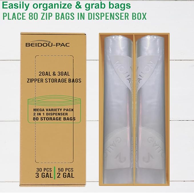 - 1, Variety Pack Meet Your Different Needs, this package includes 80 pcs large storage bags of different sizes in a dispenser box, 3-Gallon Zip Storage Bags, 50 pcs self-sealing bags in a value pack, 16" * 18" Zipper 3 gal size bags.