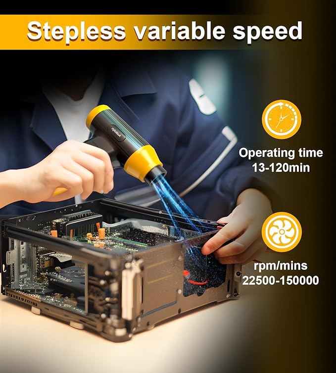 - Electric Air Duster Powerful Performance: Upgraded motorised air duster with speed up to 150,000 RPM and air speed up to 42 m/s. Allows continuous operation for 13-120 minutes.