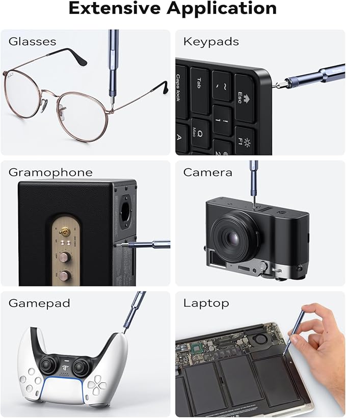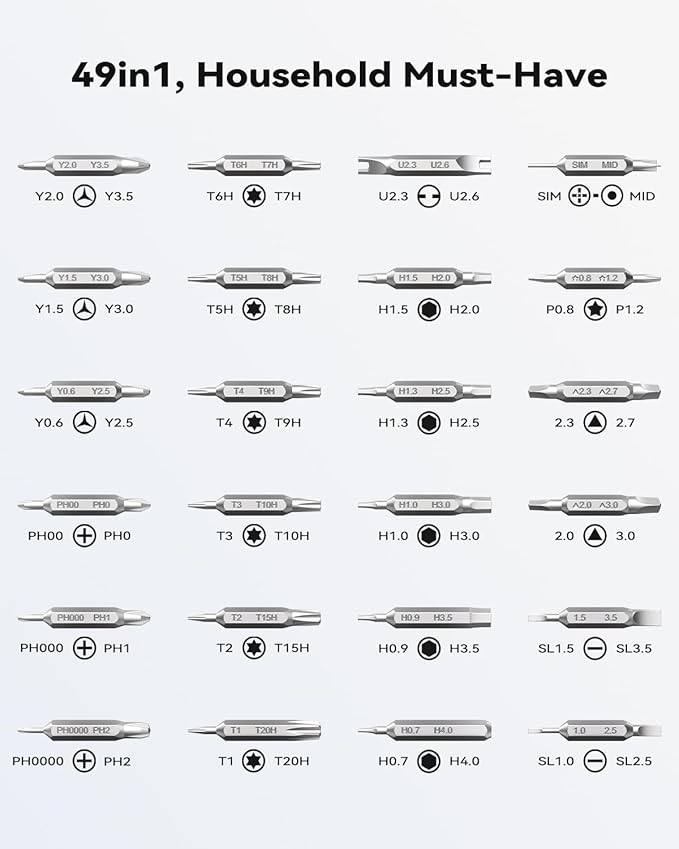 - [49in1, Household Must-Have] This small screwdriver head adopts double-sided design, making it more compact and comprehensive, it comes with 49 different bits (Phillips, Flat, Torx, Torx Security, Pentalobe, Hexagon, etc.). Whether you're a professional fixer or a home repair hobby, this mini screwdriver set has what you need to disassemble, repair, and reassemble phones, game consoles, wearables, laptops, desktops, tablets and much more!