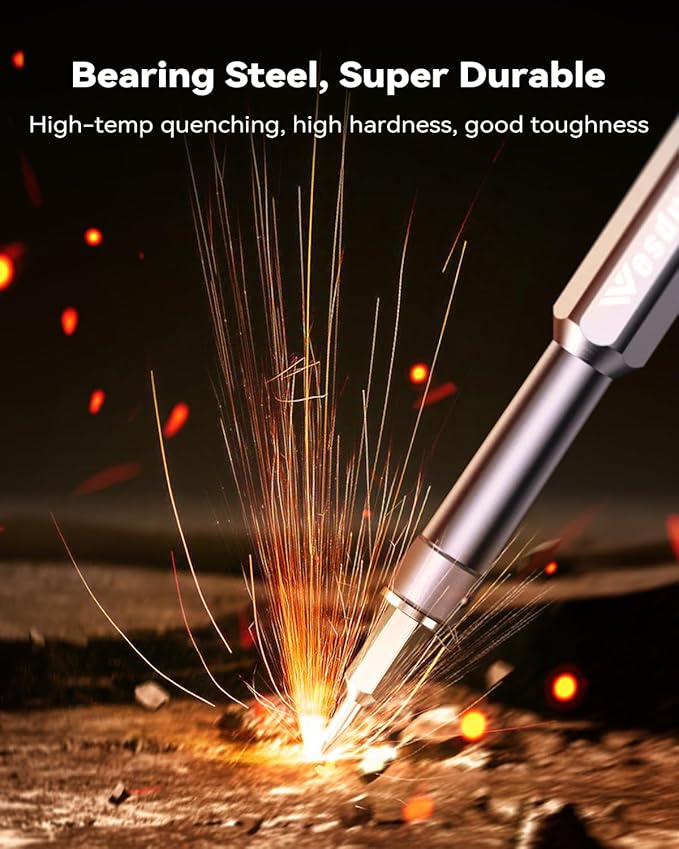 - [Bearing Steel Bits, Super Durable] All precision bits are made of the best Bearing Steel (Steel for tanks) and the hardness can reach over HRC65°, resist abrasion, oxidation and corrosion, ensure long time use. In addition, the strong magnetize-able tip easily pick-up and hold screws, helping you handle all tiny screws.