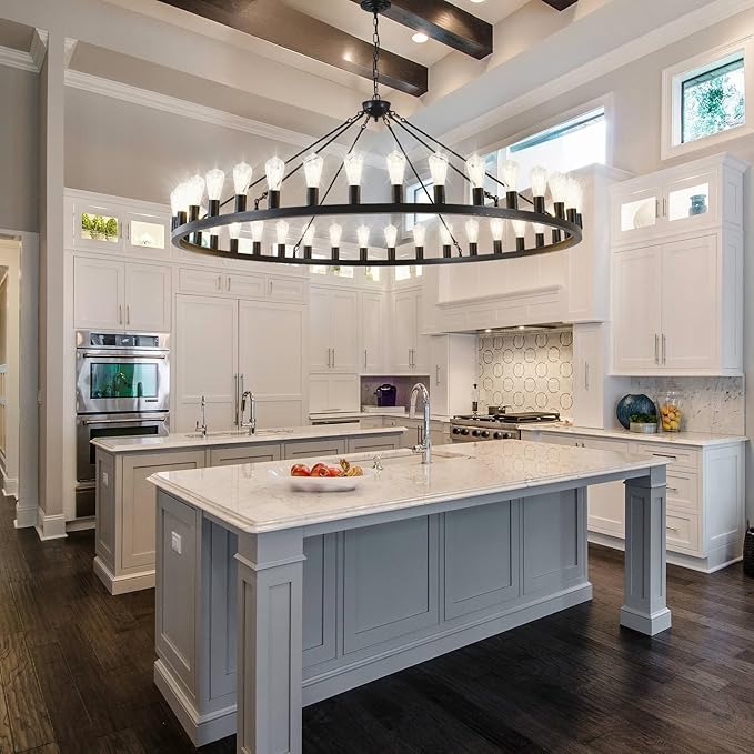 - 【 Farmhouse Wagon Wheel Chandelier 】- The black wagon wheel chandelier was made by a skilled craftsman. The 36-light design provides 360°light coverage creating a vintage industrial style and a nostalgic style.If you use a bright bulb, it will illuminate a large space,creates a cozy home atmosphere.