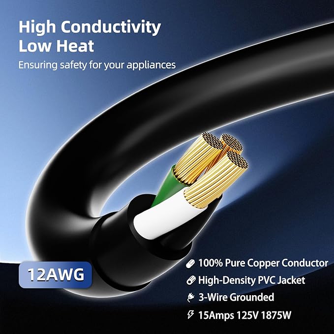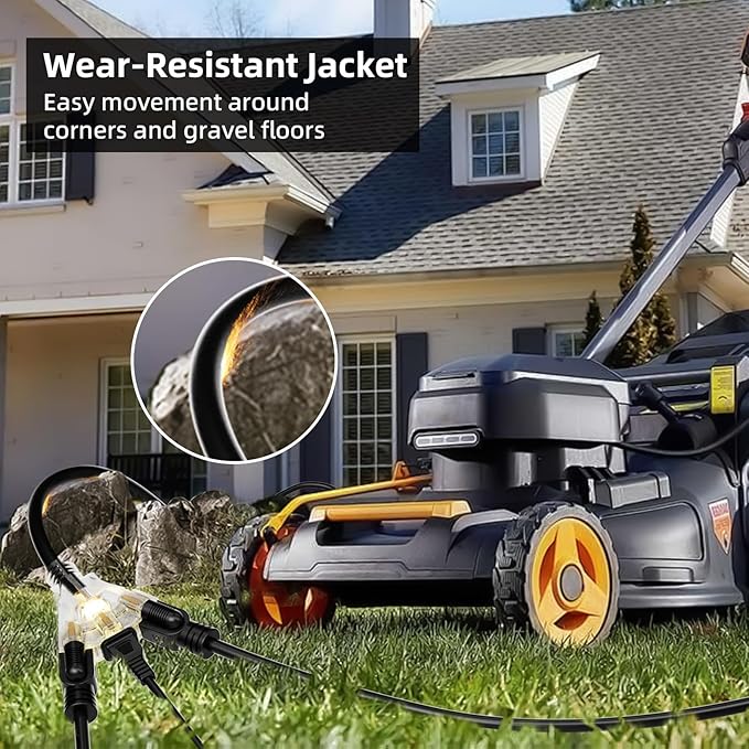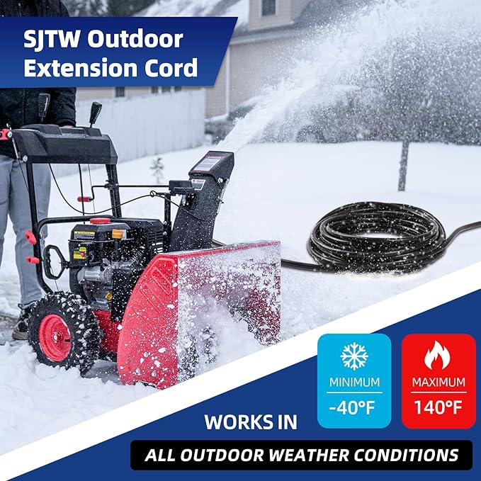 - Flexible and All-Weather Use: Heavy-duty power cord is constructed with upgraded SJTW (Service, Junior, Thermoplastic, Weather) wire, designed for durability and longevity. Outdoor extension cord can withstand temperatures ranging from -40°F to 140°F, remaining flexible and tangle-free in all weather conditions without becoming stiff or cracking. The high-density PVC material ensures resistance to breakage during long-distance movement and stretching.