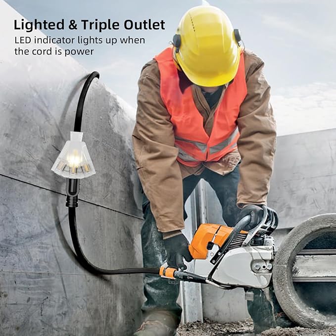 - 3-in-1 Outlet: 12/3 multiple outlets extension cord is designed with 3 grounded outlets at different angles, making it easy to power multiple appliances simultaneously without blocking each other. Multi-tap pig-tail extension cord is super convenient, letting you add another tool or device without needing an extra cord.