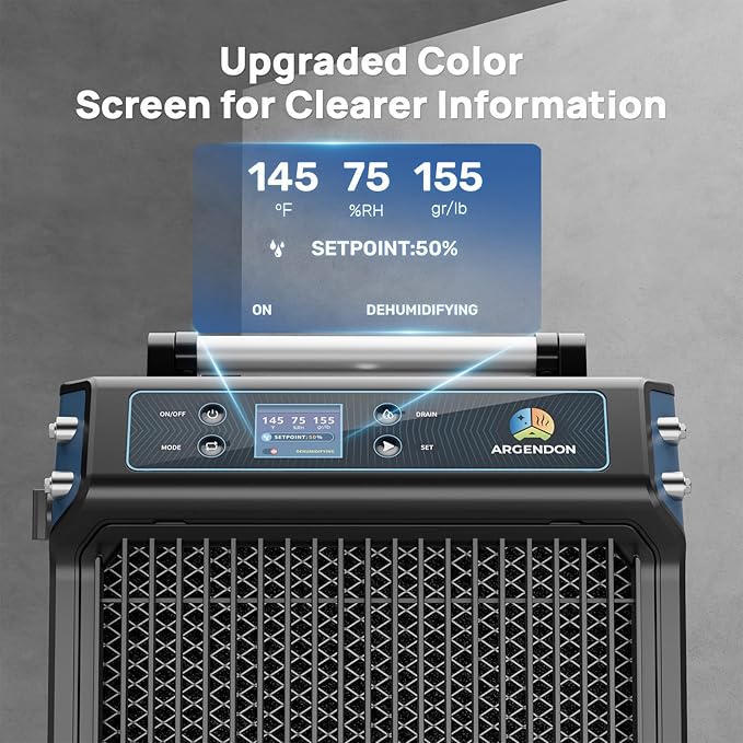 - Powerful Industrial-Grade Moisture Control: The Argendon commercial dehumidifier with pump is specifically designed for commercial and industrial settings, offering a powerful solution for controlling excess moisture in crawl spaces, basements, and other industrial areas. With a capacity of 180 pints at 90°F and 90% humidity, it can effectively dehumidify areas up to 2,300 Sq.Ft. Equipped with a convenient drain hose, continuous drainage is made easy for hassle-free operation.