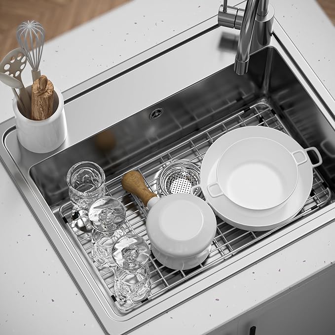 - Protective Sink Rack for Kitchen Sink- Sink grid is the easiest way to protect your sink from scratches and damage. They protect the surface of the sink from the utensils, pots, pans, cutlery and dishes. The 1" vinyl feet and protective bumpers ensure that the sink grid does not leave any marks.A must-have on your list of your home essentials.