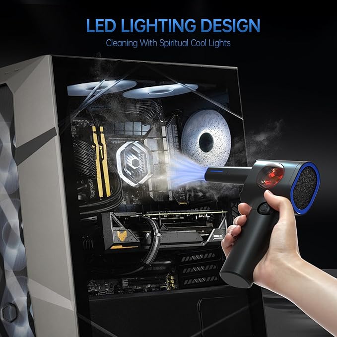 - 【Cool LED Light】ATEngeus Electric Air Duster equipped with LED light, which can also clean dust well in dark corners and dark environments. The rotating motor of the machine body is also equipped with cool dynamic LED lights, and the light color can change with the change of blowing force. The Air Dusteris more fashionable and is no longer a monotonous cleaning tool, making daily cleaning full of vitality.