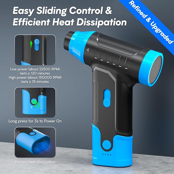- 2024 Newest Compressed Air Duster with 150000 RPM Brushless Motor : Effortlessly cleans out the tiniest crevices of your electronics. This FreeTim air duster can effectively sweep away nearly all dust and dirt. This dust blower features a heat dissipation system, which allows you clean at ease for longer time, without worrying about the air blower getting too hot to hold