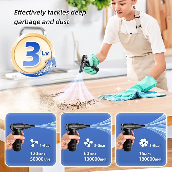 - High-Speed Brushless Motor:The cordless electric air duster has a maximum speed of 180000RPM, which can generate super strong airflow, designed to help you easily clean even the tiniest dust particles. It is equipped with a three-speed adjustable wind speed button to meet your deep cleaning needs for different devices. This air air duster is energy-saving and durable, maintaining excellent performance, and is a must-have cleaning tool for the family.
