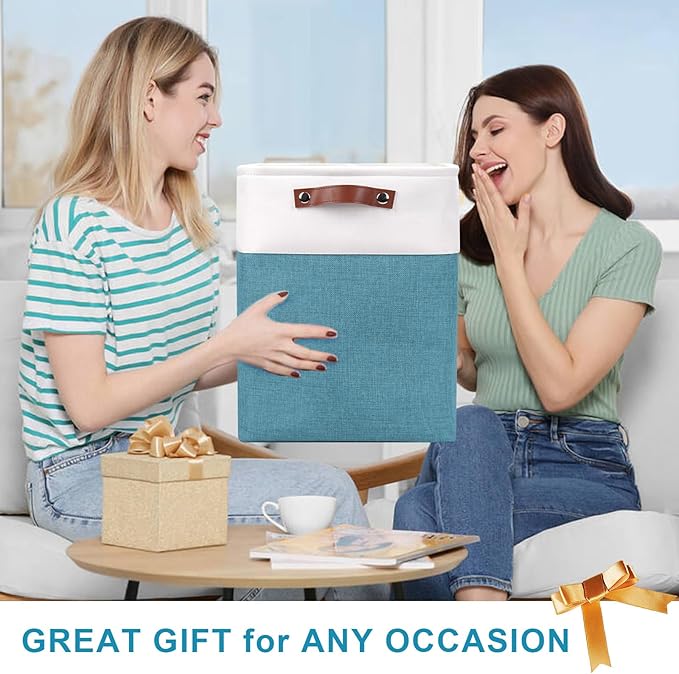 Large Fabric Storage Baskets | 50L Storage Bins, Decorative Linen Closet Baskets with Handles for Organizing, Shelf, Toys, Clothes, Home, Office, Nursery, 17x12x15Inches (Teal&White)