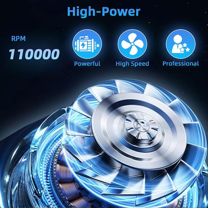 - Stepless Powerful Cleaning with Different Nozzles: The cordless electric air duster is equipped with an upgraded motor and max rotating speed is 110000 RPM. The nozzle can be replaced for different scenes. The power is 55W, continuously providing high-pressure air to remove dust, can produce super-strong airflow