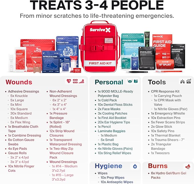 - COMPLETE PREPAREDNESS SYSTEM — Unlike standard kits filled with basic bandages, our kit includes professional-grade supplies chosen by first aid experts. It's designed to tackle not just minor cuts but also severe wounds, sprains, fractures, burns, insect bites, fever, and hypothermia, making it a true lifesaver in critical situations.