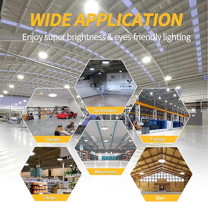 - Excellent heat dissipation & Sturdy Quality - The aluminum housing and the special designed heat sinker features great thermal conductivity for advanced heat dissipation, together with high quality LED and Driver extending the lifespan of our high bay lights to 50,000 hours with light decay <5%. With enclosed waterproof and dustproof structure, the commercial lights can work stably in harsh environments.