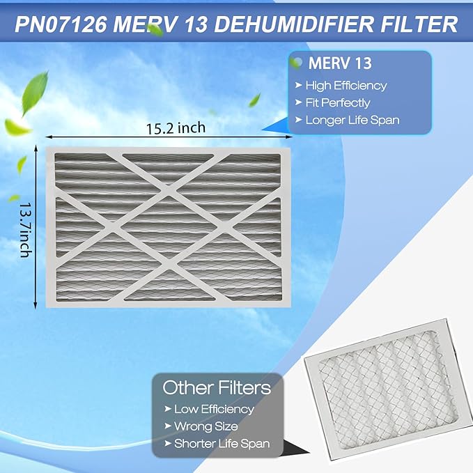 - 3.Quality Materials: We use only Pn07126 Dehumidifier Filte MERV 13 is an upgrade from the MERV 8 and MERV 11 models; performance electrostatic pleat design removes more airborne organic impurities, providing you with reliable filtration