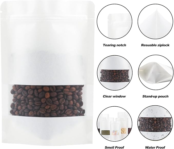 100 Pack Bags, Resealable Bags with Clear Window, Stand-up Bags for Sealing Storage, Scratch Resistant Hand Storage Bags. (White, 6.3×9.45 Inch)