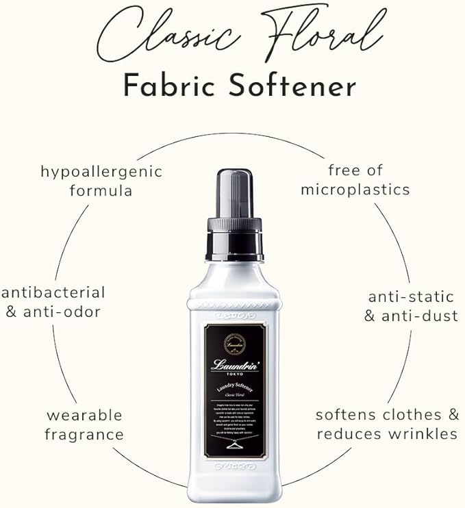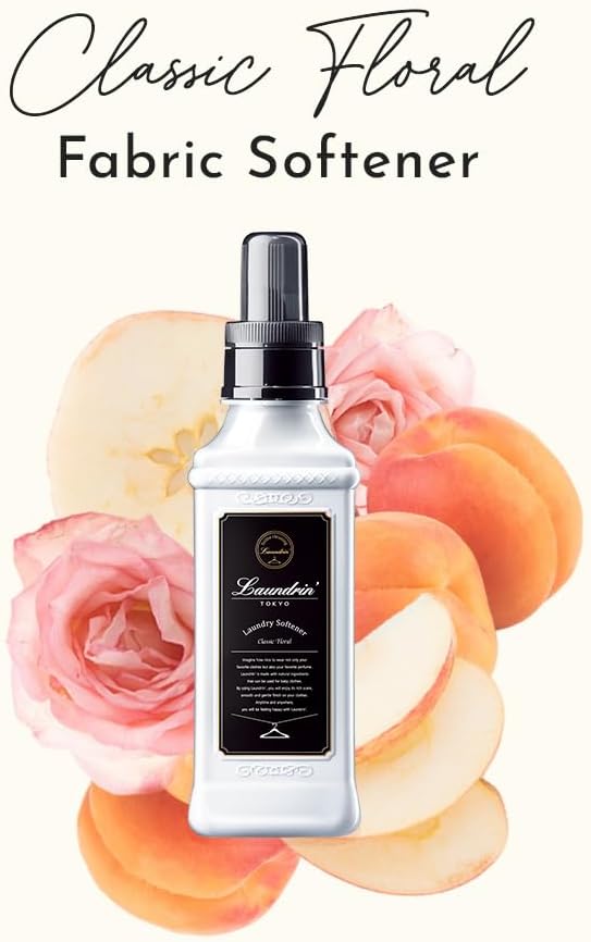- LUXURIOUS LAUNDRY SOFTENER - Transform your fabrics with the elegant scent of Laundrin Laundry Softener Classic Floral. This eco-friendly fabric softener liquid blends the fresh fragrances of Peach, Apple, and Rose, while leaving clothes soft, static-free, and safe for your health & household, including those with sensitive skin, babies, and pets.