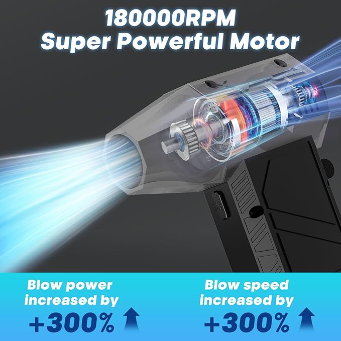 - 【180,000 RPM Super Powerful Turbine Motor】This compressed air duster has a maxi speed of 180,000 RPM, delivering up to 200G of air pressure and over 80 m/s of air velocity. The ultra high-speed turbine motor ensures superior performance and powerful airflow, allowing you to easily remove dirt hidden in every crevice of your keyboard or any electronic device with maximum efficiency, making it extremely convenient to use in your home, office, or car dust collector