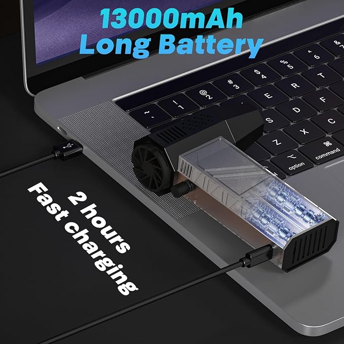 - 【13000mAh Long Battery Life & Fast Charging】This electric air duster is equipped with a 13000mAh battery for extended use time and ensures long-lasting performance. With Type-C fast charging, it can be fully charged in 2-2.5 hours. At the lowest speed setting, it can run for up to 60 minutes, providing reliable power for your cleaning tasks. In addition, our specially customized large-capacity battery has temperature protection, current protection and short circuit protection