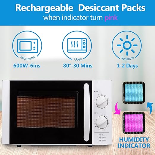- Reusable Design: easy reactivation in microwave and oven; Reactivating the moisture absorber packs are quick and simple; In the Microwave, You can remove collected moisture by microwaving 212°f for up to 6 minutes on each side; Note: use microwave power levels 1-3 for low heat to avoid melting the transparent window; Alternatively, for oven reactivation, place the reusable silica gel desiccant dehumidifier in the oven for 1 to 2 hours at 200°F to 250°F, avoiding exceeding 250°F