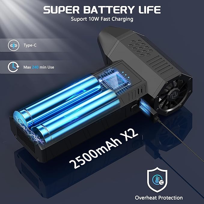 - 10W Fast Charging: The electric air duster supports Type-C cable(included) . Built-in 2500x2mAh battery. Rechargeable air duster. First gear usage time: 240 minutes (1st gear). The high-life battery is ideal for outdoor use without frequent charging.