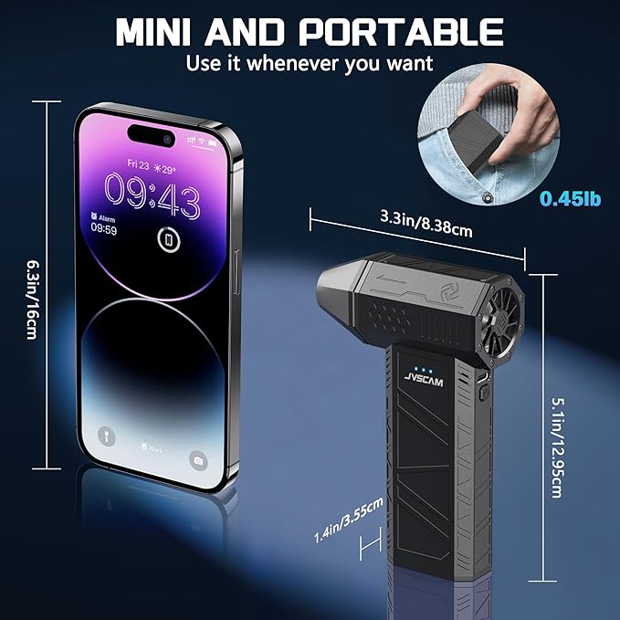 - Compact & Portable: True pocket mini air blower. The size of this mini turbofan is (5.1*3.3*1.4in). Small size and light weight (only 0.45 pounds). Easy to carry and store. You can easily store it in a toolbox, tote bag or even pocket without taking up too much space. Easy to use anytime, anywhere.