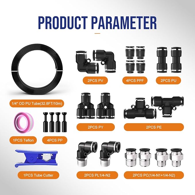 - PACKAGE : 1xPU Tube 1/4" OD (Black 32.8FT/10M) ,Each 2 pcs NPT Thread PC 1/4-N2,PC 1/4-N1,PL 1/4-N2, Each 2 pcs Plastic 1/4 PU+PV+PE+PY, Each 4pcs PP+PPF,1x Teflon Tape,1xHose Cutter