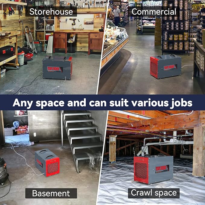 - Commercial Dehumidifier: This heavy-duty dehumidifier for crawl space removes up to 220 pints of moisture per day (under conditions of 90°F and 90% RH) and 100 pints per day at AHAM. It efficiently covers areas up to 2900 sq.ft, operating within a humidity range of 35% to 90% RH. The powerful internal compressor and 250 CFM airflow removes moisture quickly and efficiently, making it ideal for crawlspaces, basements, garages and commercial areas.